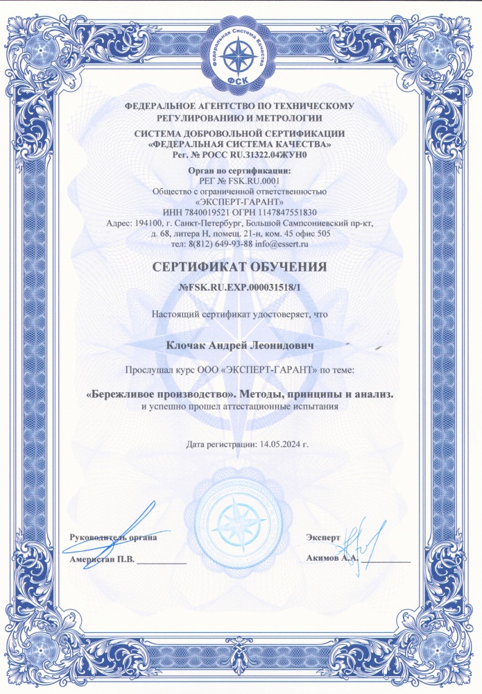 Сертификат обучения Бережливое производство Клочак А.Л.